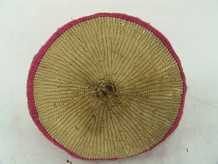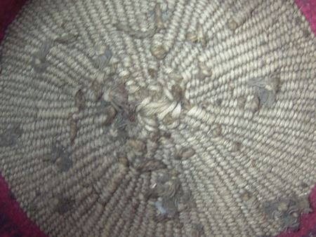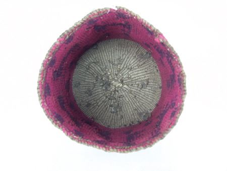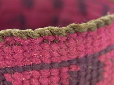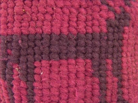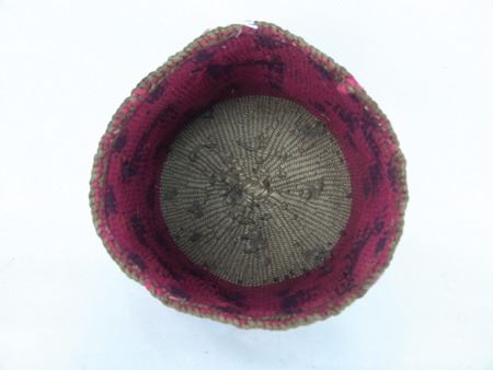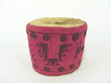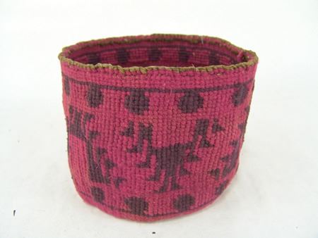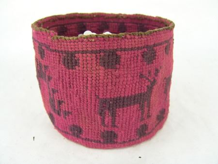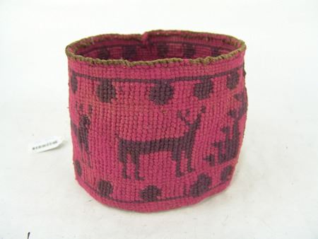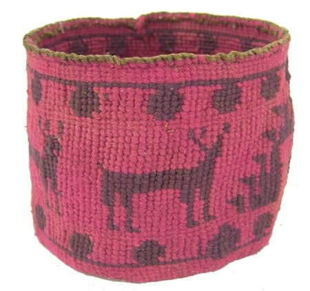 Ca. 1920s, Rare woven yarn and string "Sally" bag done in dusty rose and with deer, cherry figures, and topknot symbol. Very good condition. 5-1/2" x 7-1/4"