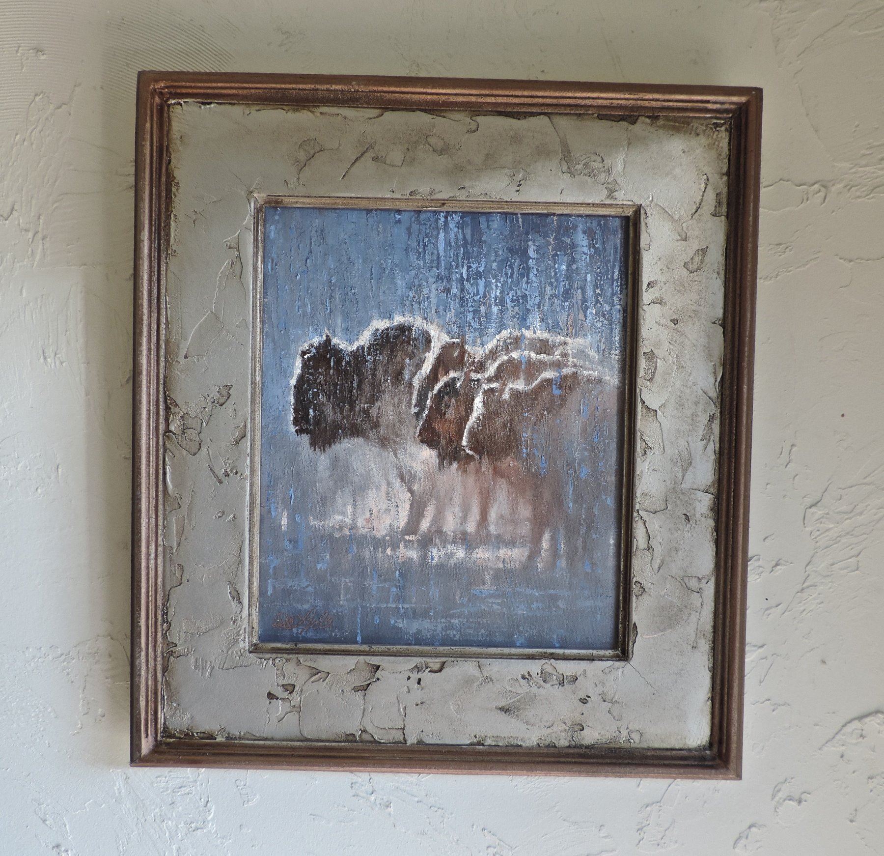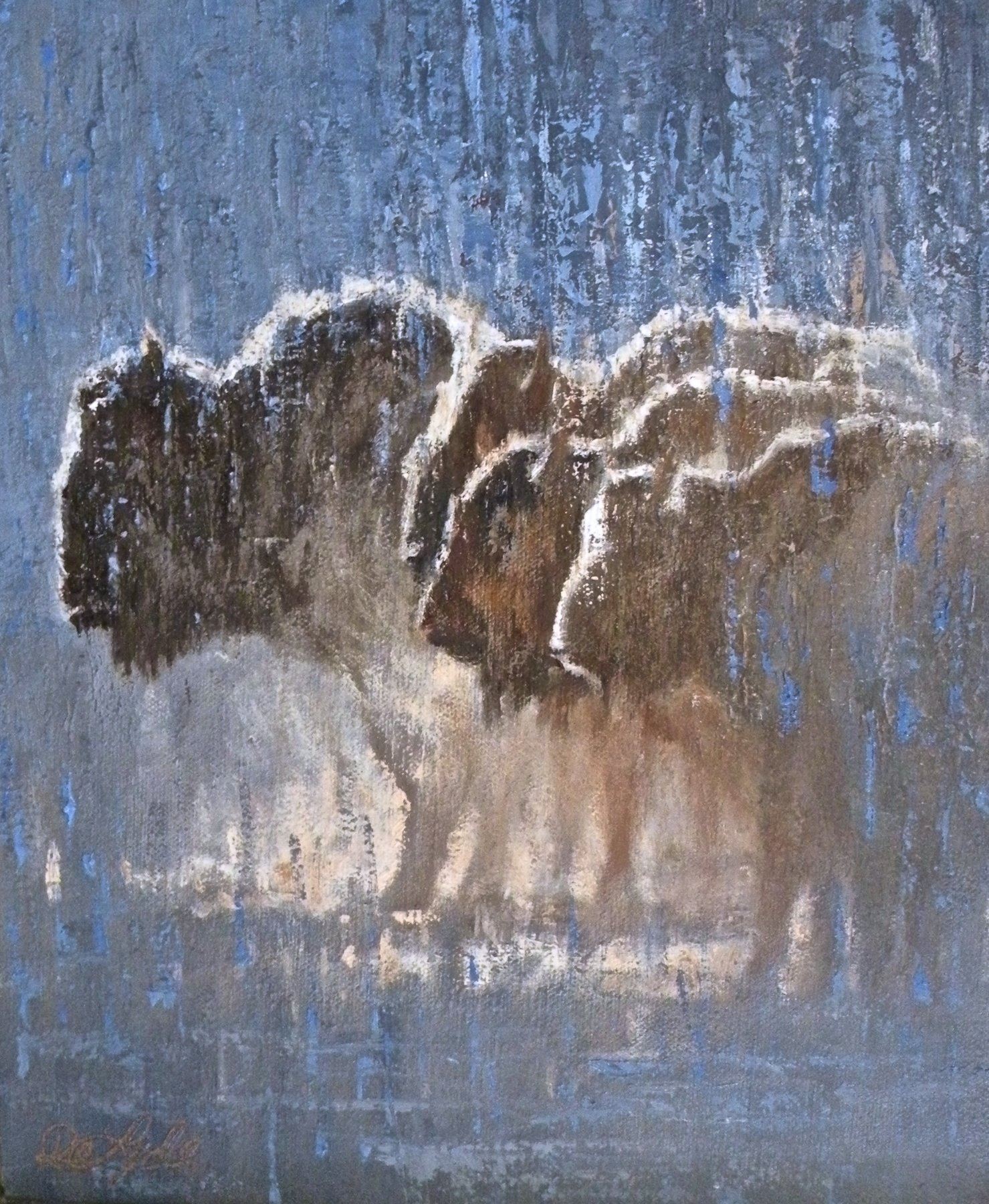 Artist: Mia DeLode. Title: Washday. Artwork size: 8" x 10". Frame: 12" x 14". Medium: Oil. Artist's description: I am always inspired by the elemental. The bison just endure without any thought or complaint, a lesson for us people? I think so!