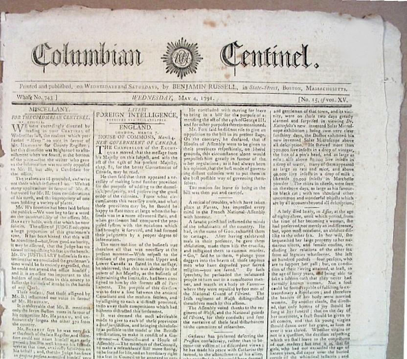 ''Columbian Centinel'' Boston, Massachusetts dated 4 May 1791. In 1789 George Washington decided to visit each of the new states. A page two report under “Pennsylvania” begins: “On the 13th inst. The President…dined at an elegant entertainment, prepared by the citizens of Richmond.” A bit more about his arrival and reception, plus word that he received a similar reception at Fredericksburg.