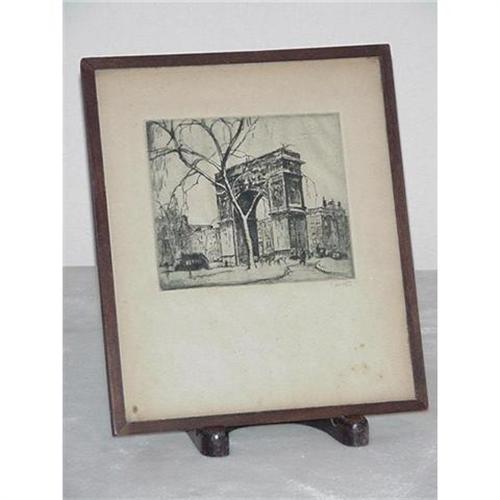 A framed engraving of the New York City park Washington Square, 8 1/2" X 10" the engraving is pencil signed EHaster as shown. The Arch was inaugurated in May 1895, this is an early image as in 1916 & 1918 pier sculptures of Washington as general and president were added. The Washington Arch is located at 5th Avenue and Waverly Place. This engraving is framed with a simple oak frame with wavy old glass. The frame has come apart as seen in the photo, it can be repaired. This is a great piece for the New York Landmark collector.