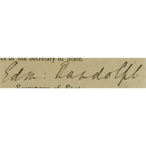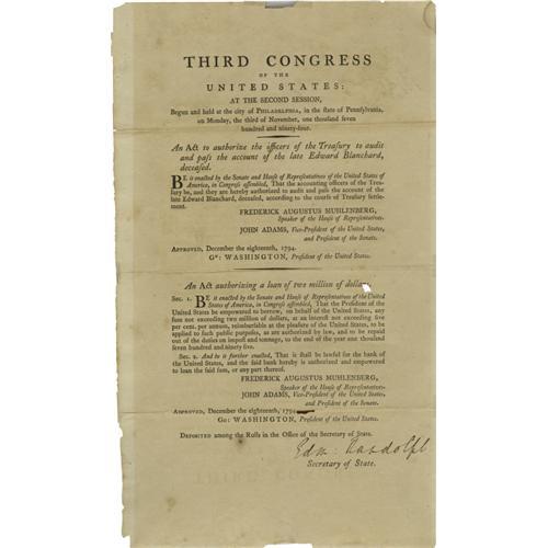 <B>George Washington Authorized by Congress in 1794 to Borrow "...any sum not to exceed two million of dollars". It is signed in print by Washington and Adams and is hand signed by Secretary of State Edmund James Randolph.</B></I> <BR><BR>A Third Act of Congress broadside which lists two acts, the first to authorize "the officers of the Treasury to audit and pass the account of the late Edward Blanchard, deceased." and second is "An Act authorizing a loan of two million dollars. Sec. 1. Be it enacted by the Senate and House of Representatives of the United States of America, in Congress assembled, that the President of the United States be empowered to borrow, on behalf of the United States, any sum not exceeding two million of dollars, at an interest not exceeding five per cent per annum, reimbursable at the pleasure of the United States, to be applied to such public purposes, as are authorized by law, and to be repaid out of the duties on import and tonnage, to the end of the year one thousand seven hundred and ninety-five. Sec. 2. And be it further enacted, That it shall be lawful for the bank of the United States, and the said bank hereby is authorized and empowered to loan the said sum, or any part thereof." One page, 7.5" x 13". Dated December 18, 1794. Fine appearance but for minor edge roughness. Very rare.