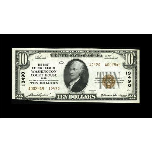 <B>Washington C. H., OH</B></I> - $10 1929 Ty. 2 <B>The First NB</B></I> Ch. # 13490<BR>While two banks were located here, this was the only one that lasted long enough to issue the 1929 notes. While a fair number of small size examples survive from here in AU or CU condition, the town name makes this an especially sought after issuer. Tonight's example is a pack fresh and nicely embossed <B>Choice Crisp Uncirculated</B></I> with an as made diagonal paper wrinkle.<BR><BR><b>Shipping:</b> Coin/Currency (<a target="_blank" href="http://www.heritageauctions.com/common/shipping.php">view shipping information</a>)