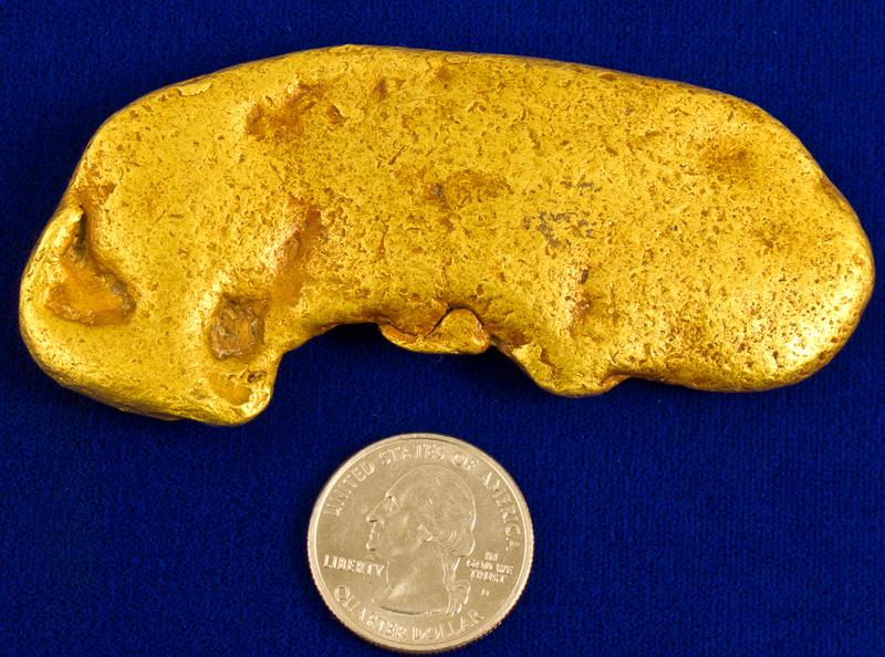 This fabulous bean shaped specimen was found in the Nevada City and Grass valley area and is a typical example of a nugget that 49'ers would have found during the great California Gold Rush. 10.16 troy ounces. Measures approx 92mm x 34mm at widest points.