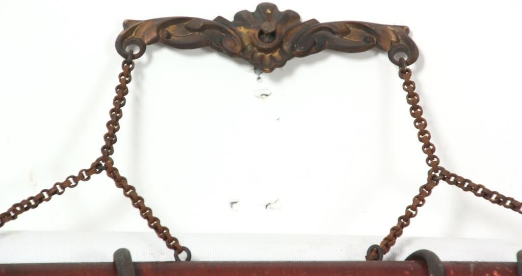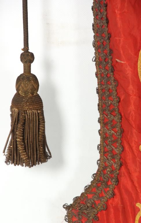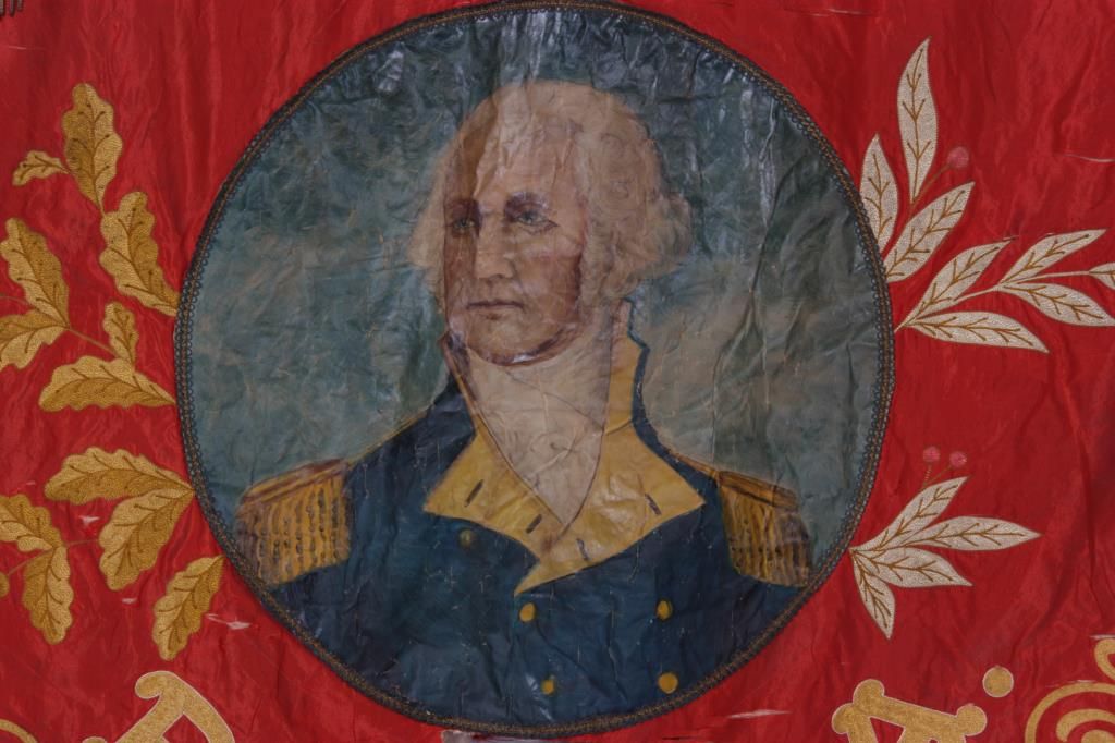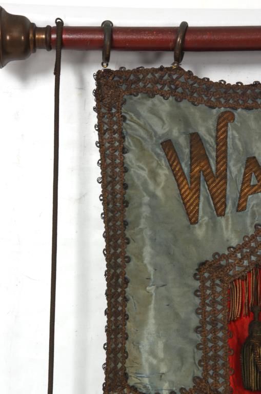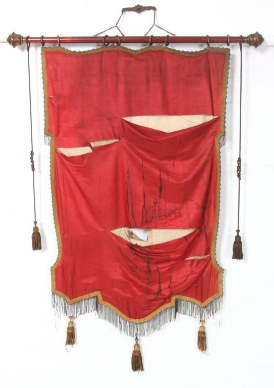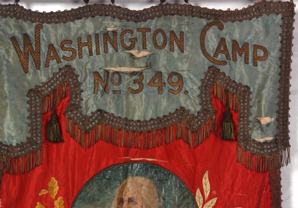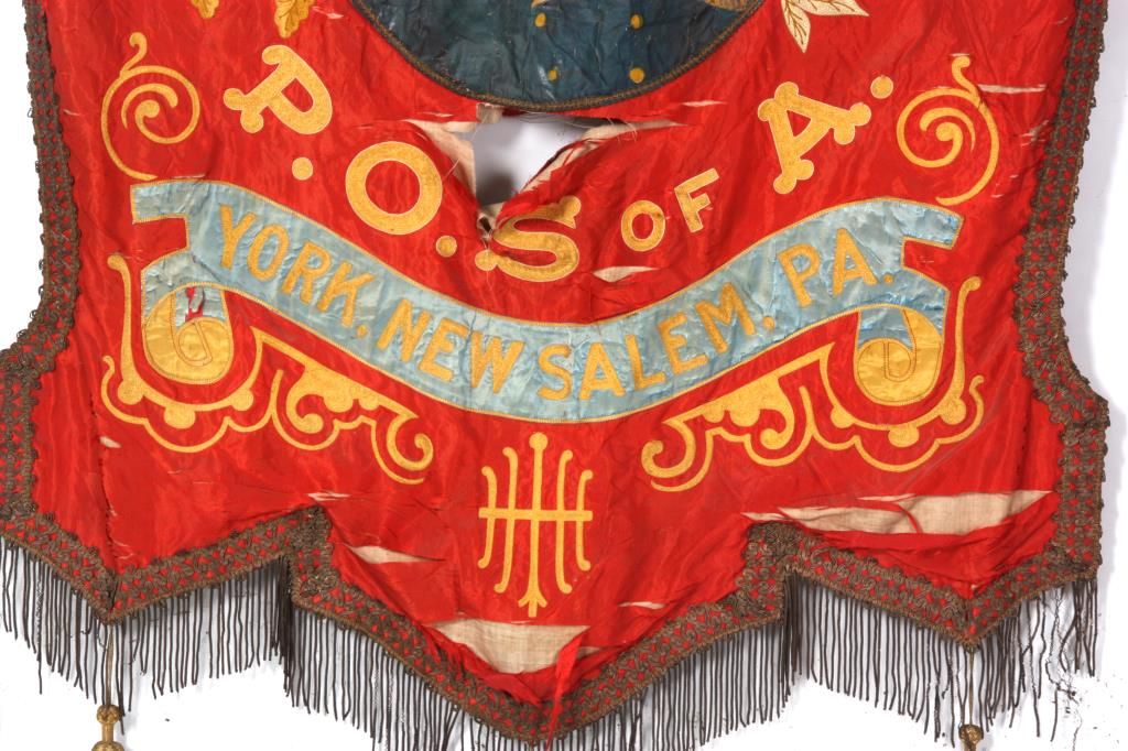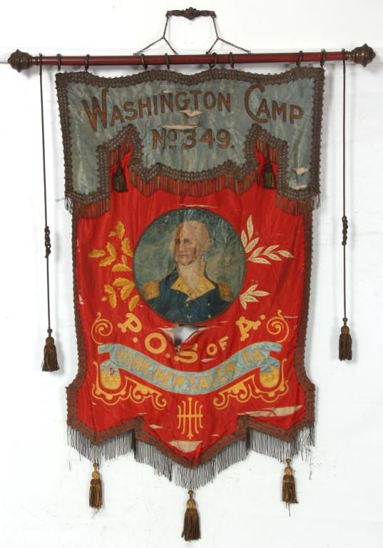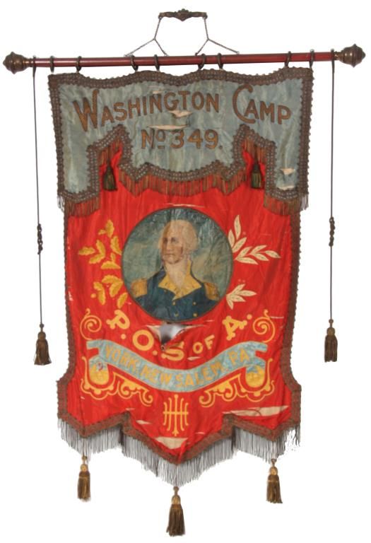 Washington Camp No. 349, Hanging Banner. Silk embroidered banner hangs from a turned wooden post, has a red background with portrait of George Washington in the center with surrounding filigree; reads Washington Camp No. 349 – P.O.S. of A. – York, New Salem, PA”; has beautiful stitched borders and hanging tassels. In used condition, good overall with some tears in areas of the red background. 58 in. high x 48 in. wide.