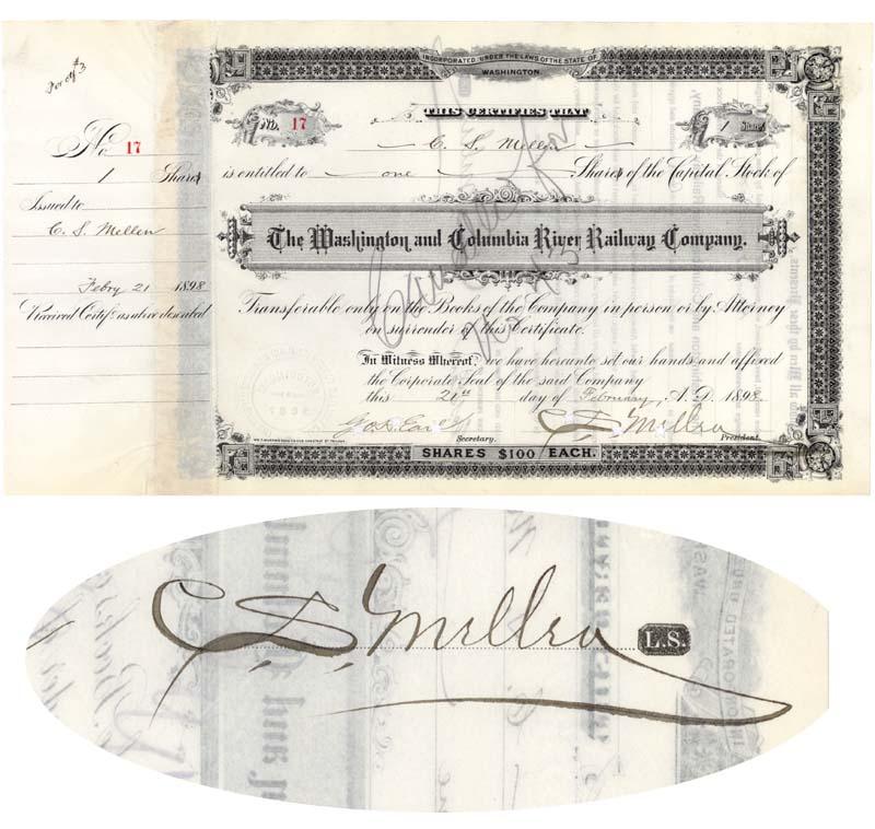 1898, Washington. Stock certificate for 1 share. Black. Issued to and signed twice by Charles S. Mellen (1851 - 1927); Railroad executive; Financier. Mellen was the front man for many of J. Pierpont Morgan's railroad schemes, and was chosen by Morgan to be president of the Northern Pacific for him. Very fine condition. Pencil and hole punch cancelled with the latter affecting Mellen's signature as President. His signature on verso is unaffected.