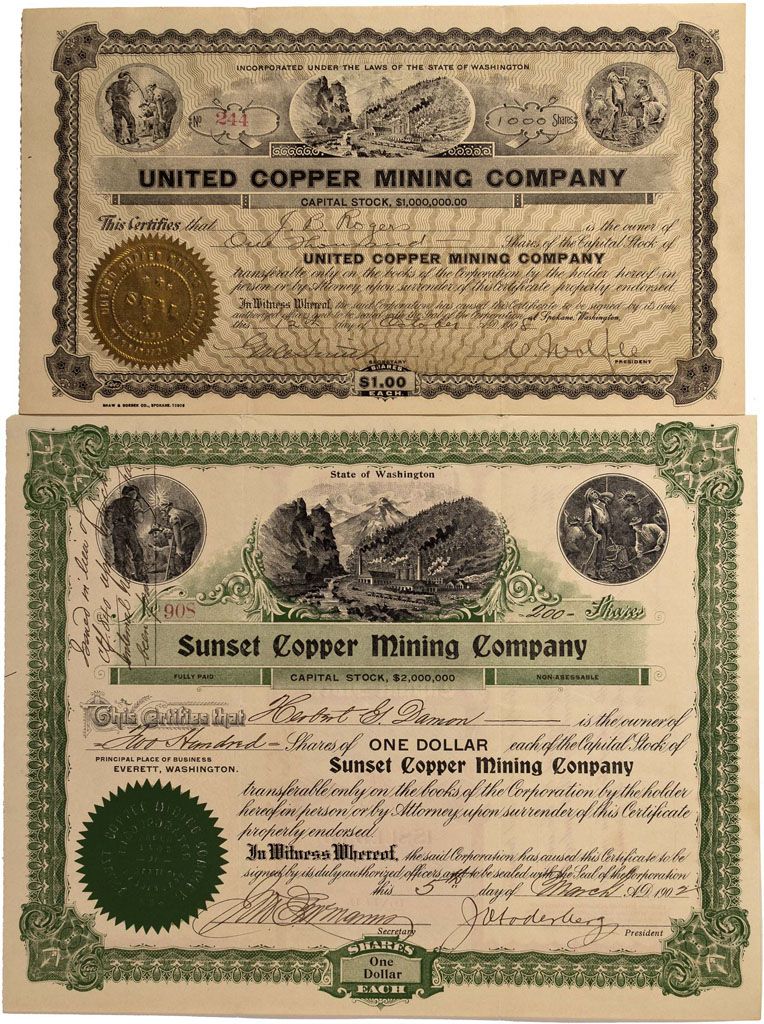 A lot of two different Washington copper mining company certificates issued 1902 and 1908. 1) Sunset Copper Mining Company: Cert. #908, issued in 1902 to Herbert G. Damon for 200 shares. Signed by J. Hoderberg as president and secretary [illegible]. Three mining vignettes. Black and green on crème. 10” x 8”. U/C. Principal place of business: Everett, Washington printed on the certificate. No printer noted. VF. 2) United Copper Mining Company: Cert. #244, issued to J.B. Rogers for 1,000 shares at Spokane in 1908. Signed by N. Wolfe as president and Gale Smith as secretary. Three mining vignettes. 10” x 5 ½”. Black on crème with gold seal.U/C. By 1908, the company produced circa 360,000 lbs. fine copper and projected by the company to be about 1 million ounces in 1909. Ore was shipped to the Northport smelter. The company planned continuous development and was building a six mile railway spur in 1908 (1908 Copper Handbook). Shaw & Borden Co., Spokane, printer. EF