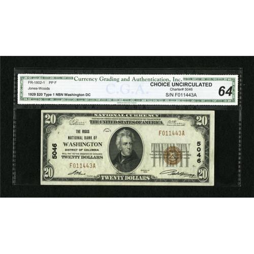 <B>Washington, DC</B></I> - $20 1929 Ty. 1 <B>The Riggs NB</B></I> Ch. # 5046<BR> A bright example from this popular DC institution graded <B>CGA Choice Uncirculated 64</B></I>.<BR><BR><b>Shipping:</b> Coins & Currency (<a target="_blank" href="http://www.heritageauctions.com/common/shipping.php">view shipping information</a>)