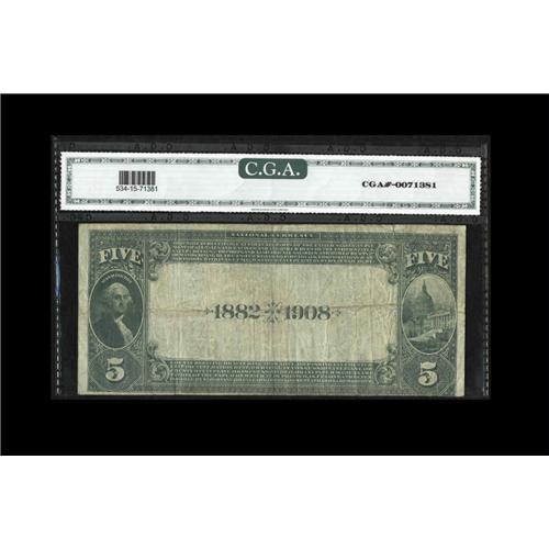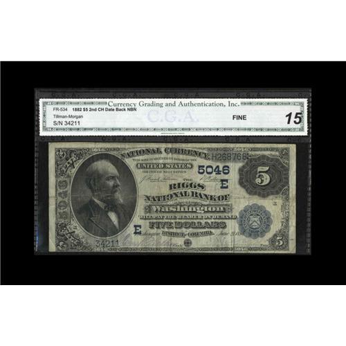 <B>Washington, DC</B></I> - $5 1882 Date Back Fr. 534 <B>The Riggs NB</B></I> Ch. # (E)5046<BR>A <B>CGA Fine 15</B></I> note from an institution whose headquarters branch is located just across the street from the Treasury Department in Washington, D.C. Notes from the nation's capital are avidly collected and there never seem to be quite enough to go around, especially when it comes to scarcer types such as this.