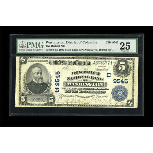<B>Washington, DC</B></I> - $5 1902 Plain Back Fr. 600 <B>The District NB</B></I> Ch. # (E)9545<BR>While not a particularly scarce bank, this note bears the imprimatur <B>PMG Very Fine 25</B></I> and is from a strongly collected locale.