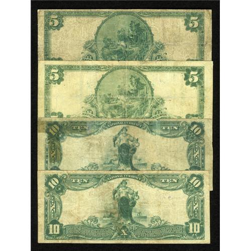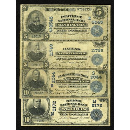 <B>Quartet of Large Size Nationals</B></I><BR> Washington, DC - $5 1902 Plain Back Fr. 600 The District NB Ch. # (E)9545<BR>Dallas, TX - $5 1902 Plain Back Fr. 607 Dallas NB Ch. # 11749<BR>Charleston, SC - $10 1902 Plain Back Fr. 628 The Bank of Charleston National<B> </B></I>Banking Assoc Ch. # (S)2044<BR>Saint Louis, MO - $10 1902 Plain Back Fr. 632 The State NB Ch. # 5172<BR>These notes mostly grade <B>G-VG</B></I> with St. Louis, MO a solid <B>VG</B></I>.<BR><BR><BR><BR><BR><b>Shipping:</b> Coins & Currency (<a target="_blank" href="http://www.heritageauctions.com/common/shipping.php">view shipping information</a>)