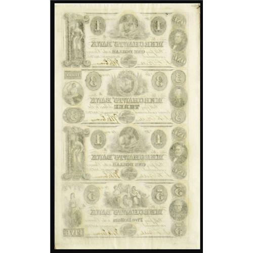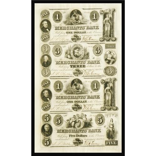 <B>Washington, DC- Merchants' Bank</B></I> $1-$3-$1-$5 July 1, 1852<BR>This is the first time we have encountered an uncut sheet on this fraudulent bank. Three presidents are pictured on different notes - Millard Fillmore, Andrew Jackson, and Zachary Taylor. <B>Crisp Uncirculated.</B></I>