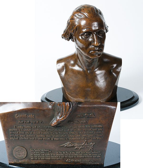 [washington, George] Bronze Bust - Identical Copy of Houdon Bust At Mount Vernon. Height: 18 in., width: 13 in., depth: 9 in., on black marble base. 19th century. Engraved on the flat portion at the back of the bust is a "Certificate and Oath" New York City, May 6th, 1898, swearing that the bust is "a perfect reproduction of the Life-Cast Bust of Washington, cast and modeled from life at Mount Vernon, Va., in the year 1785, by the eminent French sculptor, Jean Antoine Houdon…." The notary name and seal are engraved. At lower left is "The Henry-Bonnard Bronze Co…. (Copyright 1898)". A copy of the same bust is in the headquarters of the Daughters of the American Revolution in Washington, D.C.