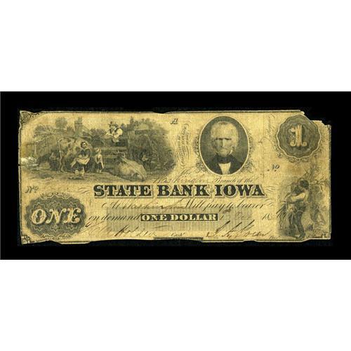 <B>Washington, IA- State Bank of Iowa</B></I> $1 Oct. 17, 1859 Oakes 110-1<BR>Oakes estimates that only between 1 and 5 examples of this issue are likely to exist. This <B>About Good</B></I> is missing a corner and has some compromises about the edges, but still as nice, or better than the plate note in Oakes's reference.<BR><BR><b>Shipping:</b> Coins & Currency (<a target="_blank" href="http://www.heritageauctions.com/common/shipping.php">view shipping information</a>)