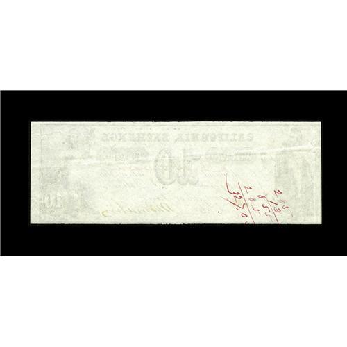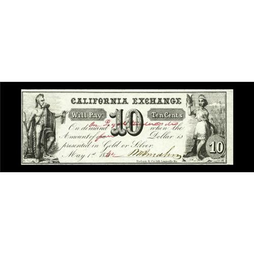 <B>Washington, IN- California Exchange</B></I> 10¢ May 1, 1862 Wolka UNL<BR>Unlike the later issue from here that is listed in Wolka, each of these unlisted pieces is pen altered to indicate that it is payable in Legal Tender Notes. <B>About Uncirculated.</B></I>