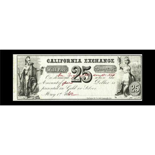 <B>Washington, IN- California Exchange</B></I> 25¢ May 1, 1862 Wolka UNL<BR>The Wolka reference does not list this denomination even in the later 1863 issue. This is the only note in this group which is unsigned. <B>Extremely Fine.</B></I>