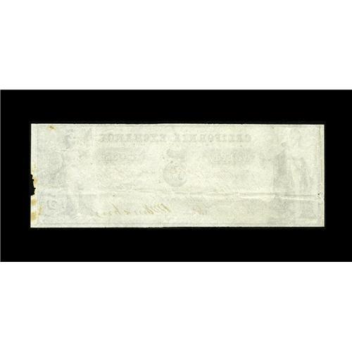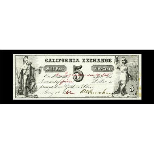 <B>Washington, IN- California Exchange</B></I> 5¢ May 1, 1862 Wolka UNL<BR>This is the first of four different denominations from this enigmatic issuer. None of these notes are listed in the Wolka reference, which does list a later issue from here dated January 1, 1863. These notes also lack the printed issuing location, which the 1863 emission contains. <B>Extremely Fine,</B></I> with a couple of rust spots in the right margin.