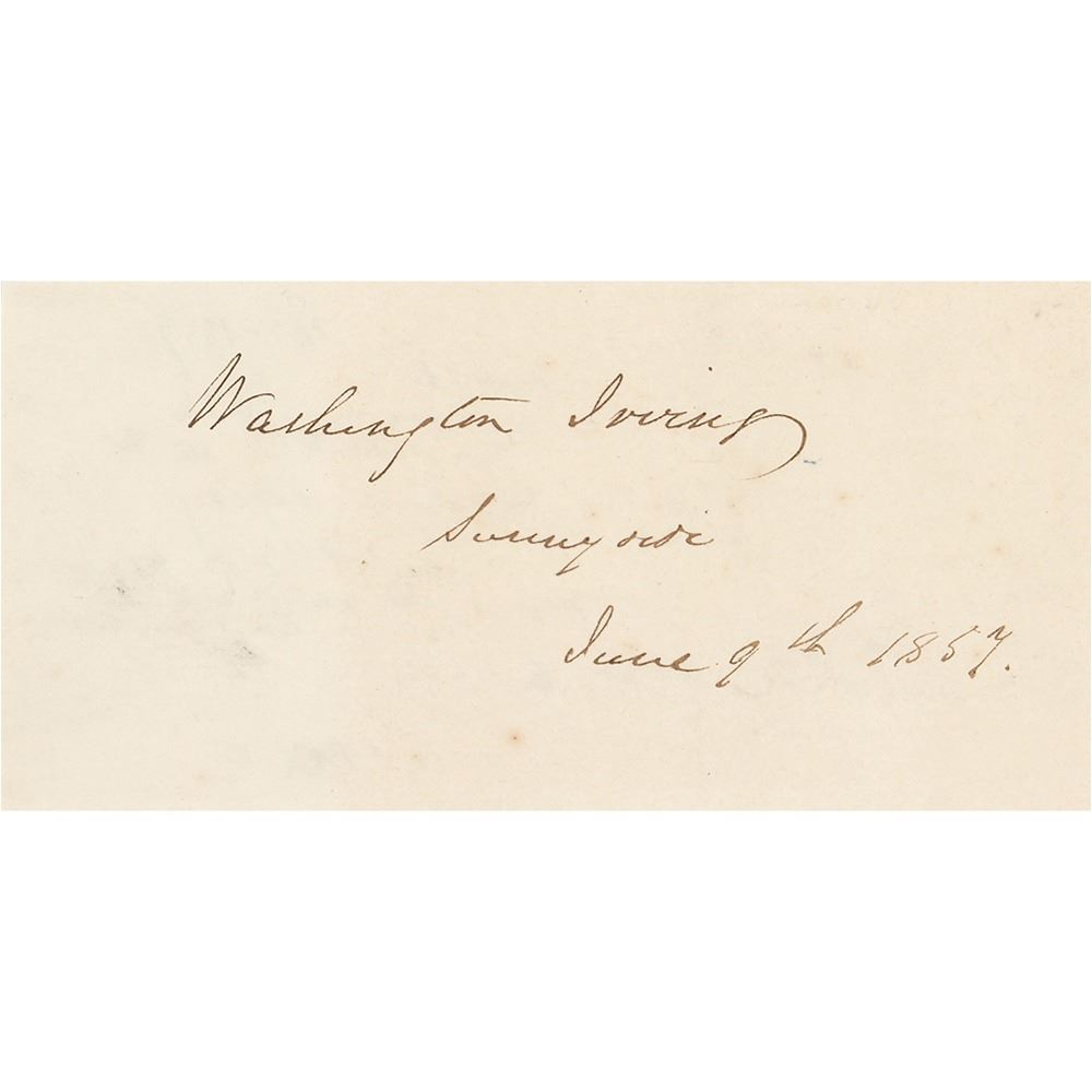 Vintage ink signature, "Washington Irving, Sunnyside, June 9th 1857,” on an off-white 4.5 x 2.25 sheet. In fine condition. Accompanied by a carte-de-visite of Irving published by E & H. T. Anthony & Co., from a "Photographic Negative in Brady's National Portrait Gallery."