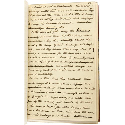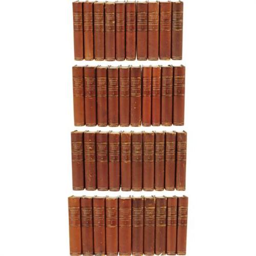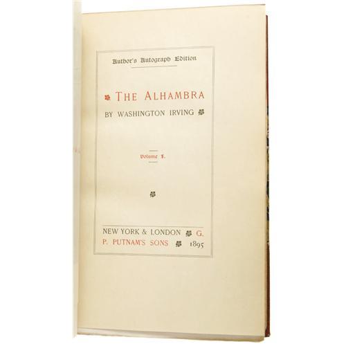 <B>Washington Irving:<I> Works of Washington Irving</B></I> Author's Autograph Edition.</B></I> (New York: G. P. Putnam's Sons, 1895-1897), author's autograph edition limited to 500 copies of which this set is numbered 160 on a special limitation page bound in front, VI of <I>The Alhambra</B></I> has an original Irving manuscript page bound in after the limitation page, half brown morocco with marbled endpapers, two spine compartments between three raised bands, gilt titles, marble endpapers, gilt top edge, gilt rules on front and back boards, ribbon markers in each volume, untrimmed pages, 8vo (5.5" x 8"), set is in near fine condition with some scuffing to the leather at the head and tail of the spine and minimal shelf wear. A beautiful set containing Irving's works including <I>Life of George Washington,</B></I> <I>Astoria,</B></I> <I>Tales of a Traveller,</B></I> <I>Knickerbocker's History of New York,</B></I> <I>The Adventures of Captain Bonneville</B></I> and several others.<BR><BR><b>Shipping:</b> Books & Catalogs (<a target="_blank" href="http://www.heritageauctions.com/common/shipping.php">view shipping information</a>)