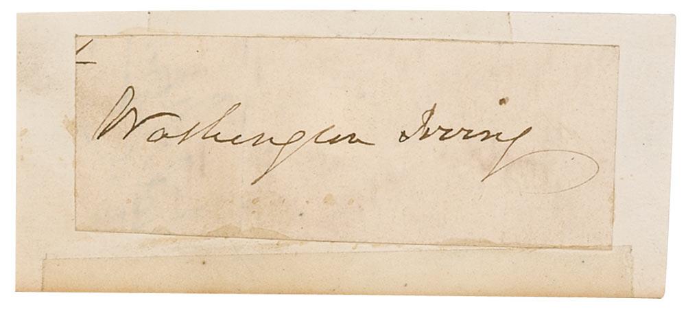 American author (1783–1859) best known for his stories ‘The Legend of Sleepy Hollow’ and ‘Rip Van Winkle.’ Ink signature, “Washington Irving,” on an off-white 2.5 x 1 clipped slip, affixed to a slightly larger off-white slip. Scattered light soiling and toning from adhesive on reverse, otherwise fine condition.