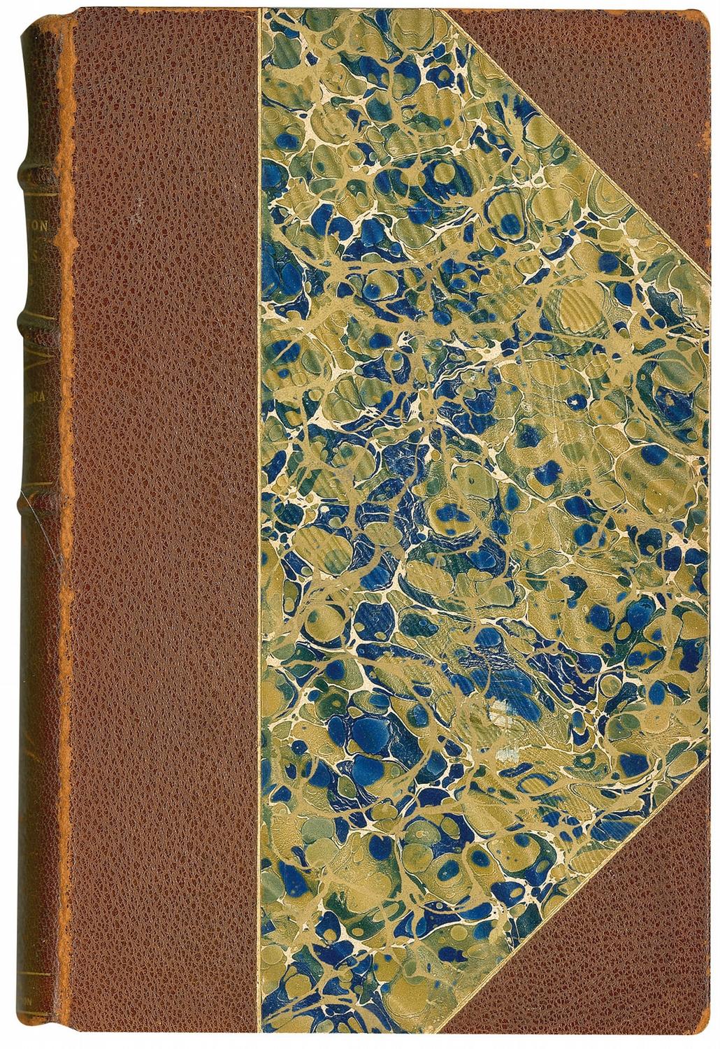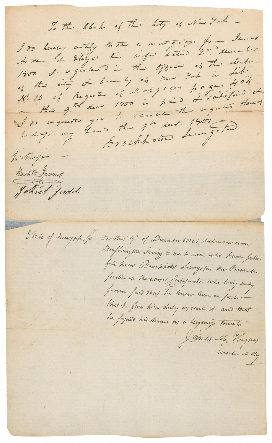 Manuscript DS, signed “Washtn Irving,” one page, 7.5 x 11.5, dated December 9, 1801, tipped into an opening page of a limited edition leatherbound hardcover copy of The Alhambra. The document, written and signed by Brockholst Livingston certifies that a mortgage is paid and satisfied. Another manuscript DS underneath, signed “James M. Hughes / Master in Chy” certifies that he personally knows Irving. Opposite an imprinted “The following sheet contains a page of the Original Manuscript of Washington Irving. G.P. Putnam’s Sons January, 1895” is an unsigned Washington Irving Autograph Manuscript (tipped in at corners), one page, 4.5” x 7.5”, containing 30 lines, with cross-outs and additions by Irving. The unsigned autograph manuscript is an early draft from Washington Irving’s “The Life and Voyages of Christopher Columbus,” Volume 2, Chapter VI, “Second Insurrection of Guarionex, and His Flight to the Mountains of Ciguay. [1498.]” Manuscript reads, in part: “and secured the fidelity of his soldiers, and the tidings that the Admiral was in high favour at court and on the point of coming out with a powerful squadron, struck consternation into the Rebels who had presumed upon his having fallen into disgrace. The Adelantado immediately hastened to San Domingo nor was there any attempt made to molest him on his march. When he found himself once more secuere his magnanimity prevailed over his indignation, and he sent Pedro Fernandez Coronal to offer Roldan and his band amnesty for all offenses on condition of instant obedience. Roldan feared to venture into his power and determined to prevent the emissary from communicating with his followers, lest they should be induced to return to their allegiance. When Coronal approached the encampment of the Rebels, therefore he was opposed in a narrow pass by as body of archers with their cross bows leveled. ‘Halt there! Traytor!’ cried Roldan ‘had you arrived eight days later we should all have been united.’ It was in vain that Coronal endeavoured to win this turbulent man from his career. He professed to oppose only the tyranny and misrule of the Adelantado, but to be ready to submit to the admiral on his arrival, and he and his principal confederates wrote letters.” Professional repairs and reinforcements to intersecting folds of document, uniform toning to manuscript, and toning and light damp staining to opening and closing pages of book, otherwise very good condition. Manuscript pages from authors of Irving’s stature are not common, and this is a fine example, with over 200 words in his hand.