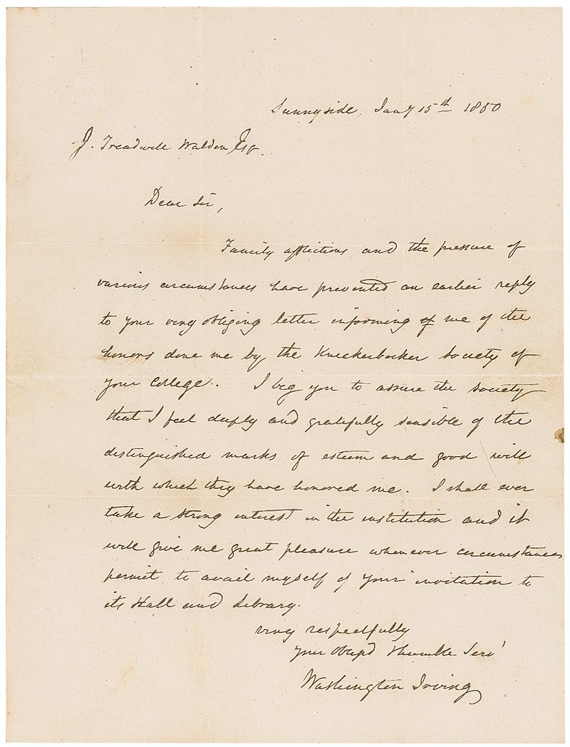 ALS, one page, 7.25 x 9.75, January 15, 1850. Letter to J. Treadwell Esquire. In part: “The presence of various circumstances have prevented an earlier reply to your very obliging letter informing me of the honor done me by the Knickerbocker Society of your college. I beg you to assure the Society that I feel deeply and gratefully sensible of the distinguished marks of esteem and good will with which they have honored me.” In very good condition, with intersecting folds and scattered toning.