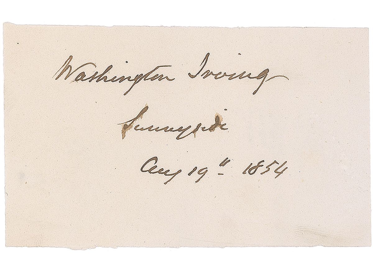 Ink signature, “Washington Irving, Sunnyside, Aug 19th 1854,” on an off-white 4 x 2.25 slip. In fine condition, with trivial brushing. Sunnyside was Irving’s estate in southern New York, an architecturally impressive ‘cottage’ that Oliver Wendell Holmes, Sr., said stood ‘next to Mount Vernon as the best known and most cherished of all the dwellings in our land.’