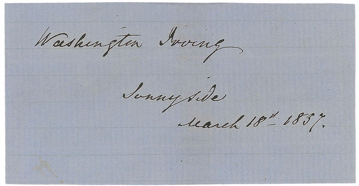 Ink signature, “Washington Irving, Sunnyside, March 18th, 1857,” on a light blue 4.25 x 2.25 lightly-lined slip. Affixed to a same-size sheet. In fine condition. Accompanied by an unsigned engraved portrait of Irving.