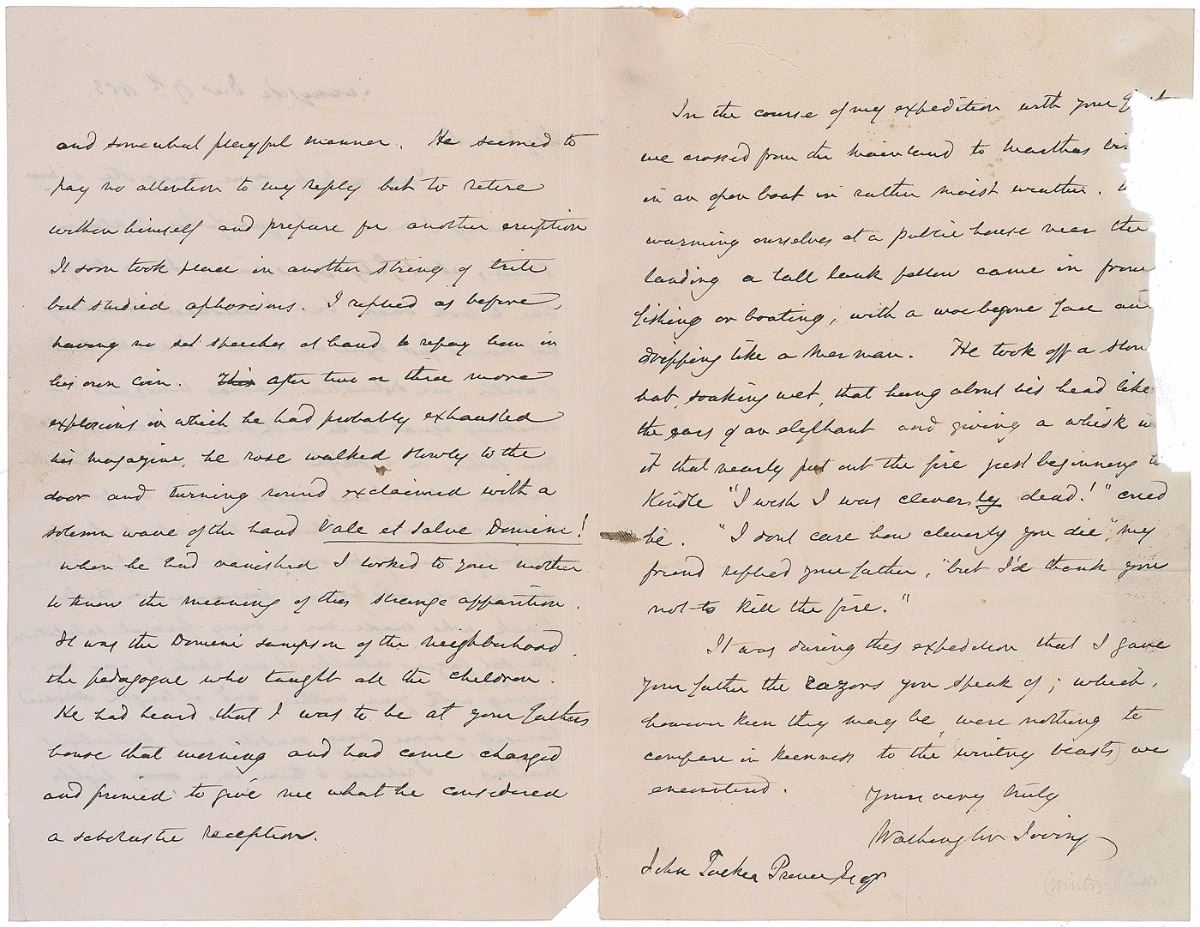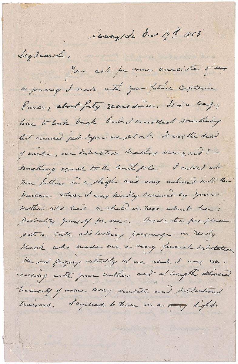 ALS, three pages on two adjoining sheets, 5.25 x 8, December 17, 1853. Letter to John Tucker Prince, in part: “You ask for some anecdote of a journey I made with your father Captain Prince, about forty years since...It was the dead of winter, our destination Marthas Vineyard!—Something equal to the North Pole… In the course of my expedition with your [father] we crossed from the mainland to Marthas Vin[eyard] in an open boat in rather moist weather. [While] warming ourselves at a public house near the landing a tall lank fellow came in from fishing or boating, with a woebegone face and dripping like a merman. He took off a Stov[e] hat soaking wet, that being about his head like the ears of an elephant and giving a whisk wi[th] it that nearly put out the fire just beginning to kindle ‘I wish I was cleverly dead!’ cried he. ‘I don’t care how cleverly you die’ my friend replied your father, ‘but I’d thank you not to kill the fire.’ It was during this expedition that I gave your father the razors you speak of; which, however keen they may be, were nothing to compare in keenness to the wintery blasts we encountered.” In very good condition, with a portion of right edge of third page torn away (omitting several words of the text), intersecting folds, a few tears to edges, and slight scattered soiling.