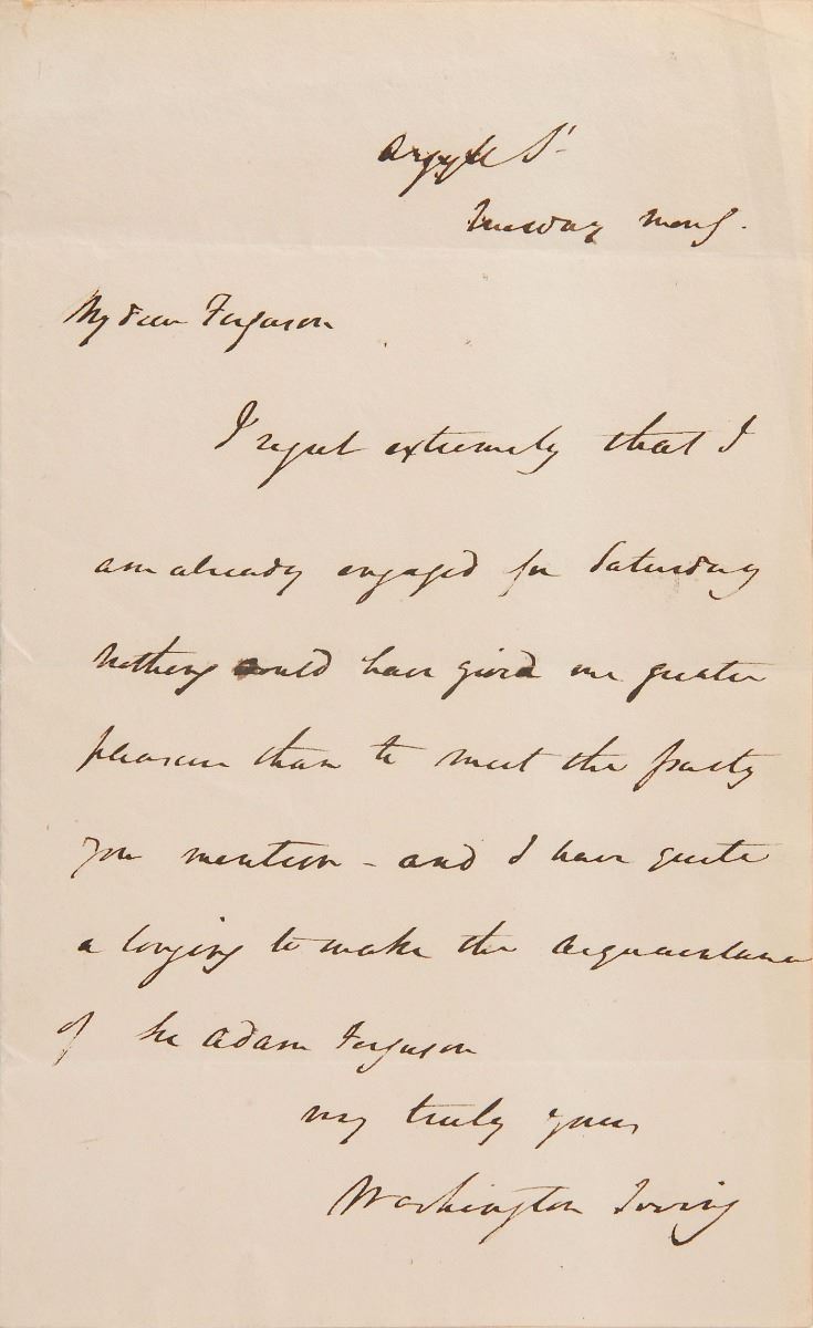 ALS, one page, 4.5 x 7.25, . Written from Argyle Street, a letter to Dr. Robert Ferguson, in full: “I regret extremely that I am already engaged for Saturday. Nothing could have given me greater pleasure than to meet the party you mention—and I have quite a longing to make the acquaintance of Mr. Adam Ferguson.” Addressed on the reverse of the second integral page in Irving’s own hand. In fine condition.