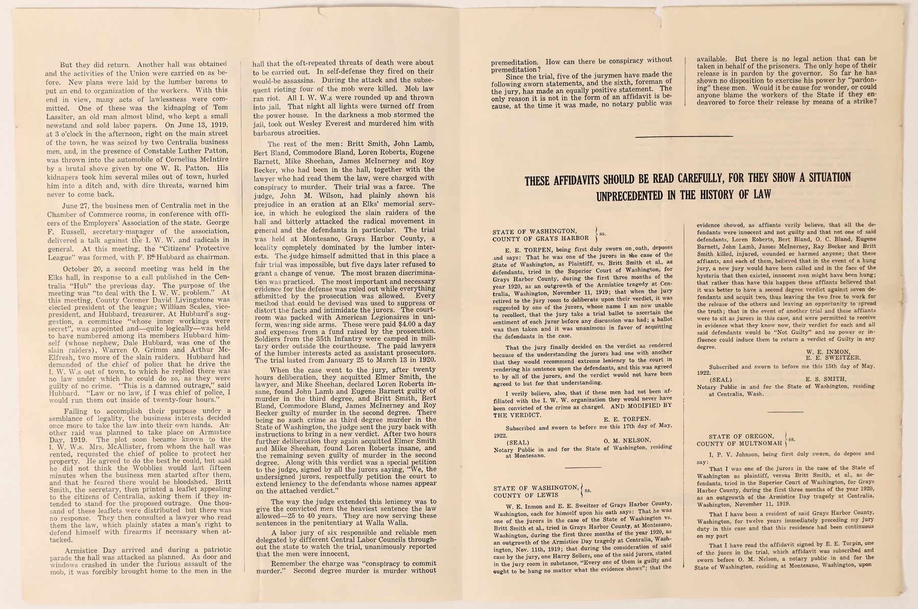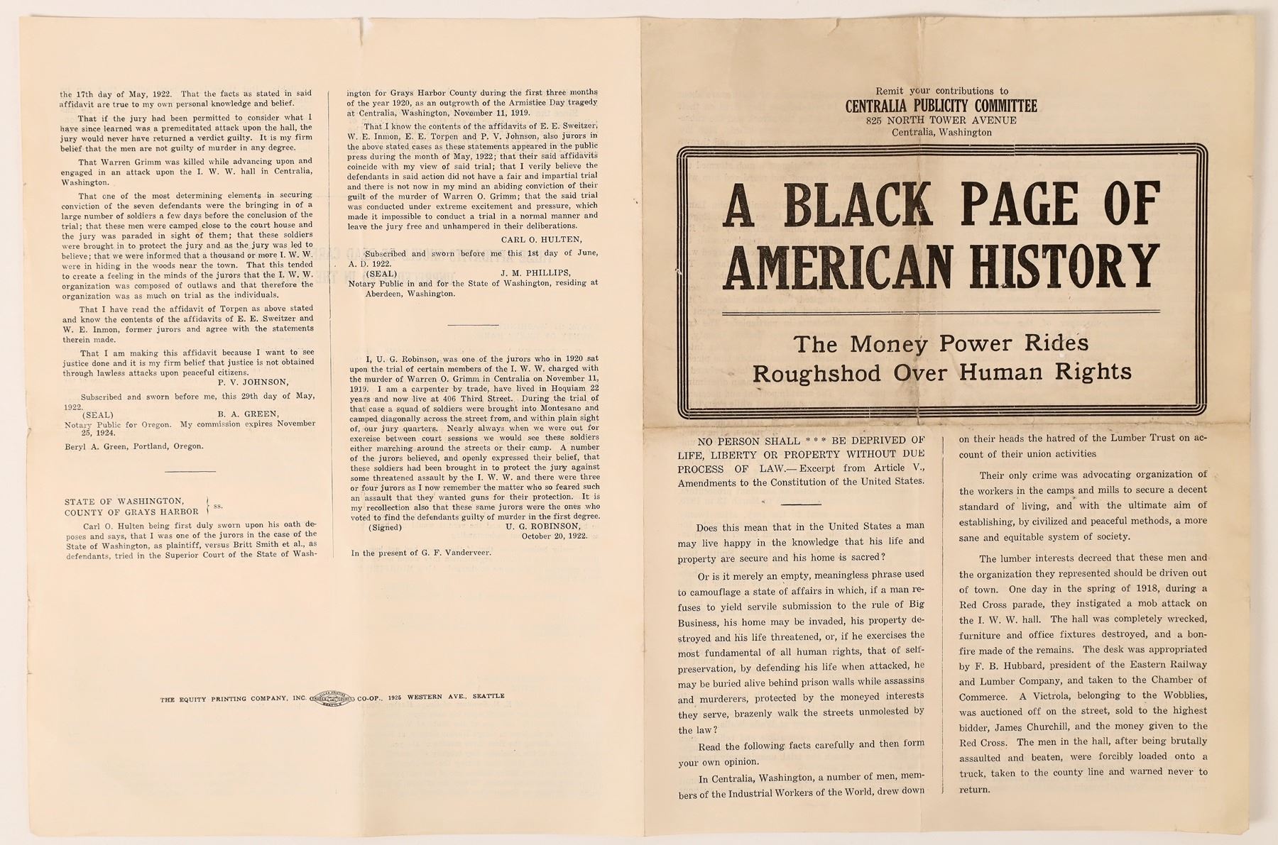 Lumber labor unrest pamphlet from Centralia, Washington. "A Black Page of American History". 4pp. Washington 1924