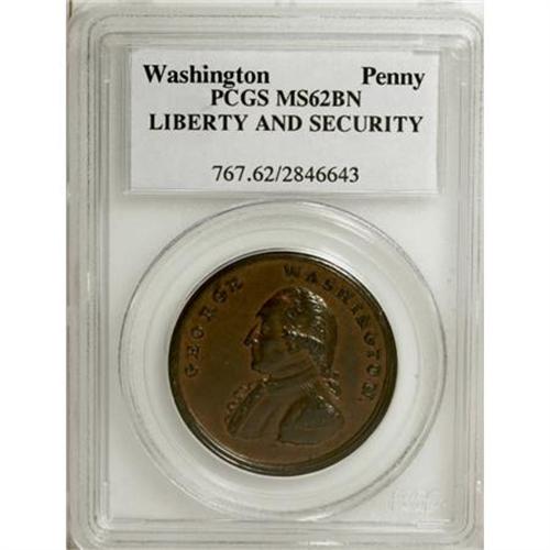 <B>Undated Washington Liberty & Security Penny MS62 Brown PCGS.</B></I> Baker-30. A moderately prooflike representative with golden-brown fields and mahogany devices. The eagle is well struck, and the portrait highpoints have only minor inexactness of strike. Only a small tick or two from a finer grade. Listed on page 80 of the 2008 Guide Book. Population: 10 in 62 Brown, 33 finer (12/07).<BR><I>Ex: Joseph M. Seventko Collection (Heritage, 1/02), lot 5208, which realized $1,610.<BR>From The Liberty Collection of United States Colonial Coinage.</B></I><BR><BR><b>Shipping:</b> Coins & Currency (<a target="_blank" href="http://www.heritageauctions.com/common/shipping.php">view shipping information</a>)