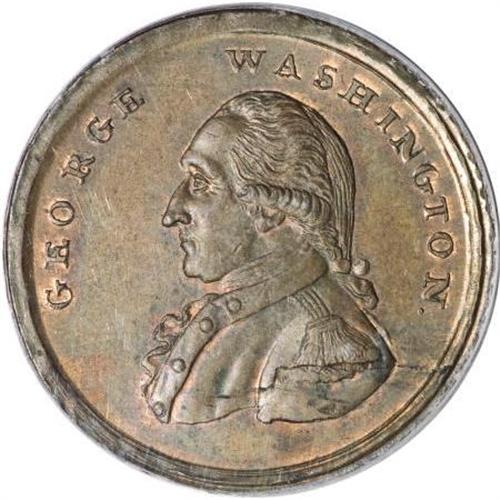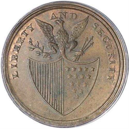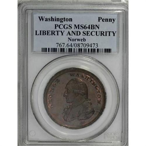 <B>Undated PENNY Washington Liberty & Security Penny MS64 Brown PCGS.</B></I> Ex: Norweb. Baker-30. Glimpses of mint red peer from the peripheral legends, although the fields and devices are toned olive-brown. Nicely struck with only minor incompleteness on the lower stars on the shield. A mint-made planchet flaw crosses Washington's shoulder. Listed on page 80 of the 2008 <I>Guide Book</B></I>. Population: 14 in 64 Brown, 4 finer (12/07).<BR><I>Ex: Norweb Collection of Washingtonia (Stack's, 11/06), lot 2034, which realized $5,060.</B></I><BR><I>From The Liberty Collection of United States Colonial Coinage, Part Two.</B></I><BR><BR><b>Shipping:</b> Coins & Currency (<a target="_blank" href="http://www.heritageauctions.com/common/shipping.php">view shipping information</a>)