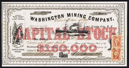 Carson City, Nevada Territory, October 15th, 1863, 7 1/2 Shares, Issued and Uncancelled Stock, S/N #137, black on Red underprint, paddlewheel steamboat in middle with standing patriotic Liberty at left and wheat at right, small dog with safe bottom center, 20cts and 5 cts Inland Exchange revenue stamps bottom right, VF-XF condition. Constitution Ledge hand written in below title. Amazing NT mining certificate.