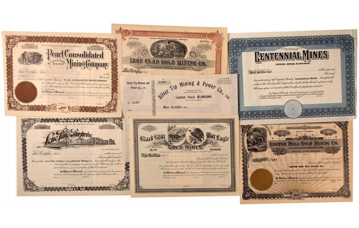 A group of seven different unissued mining stock certificates incorporated in Washington. 1) Iron Clad Gold Mining Co. 1XXX, Spokane. Lg. oval mining vignette. W.D. Knight, printers, Spokane. 2) Lone Pine Surprise Cons. Mining Co. 1XXX, Spokane. Pine tree and mountains on masthead. Tucker, Hanford Co. Seattle, printer. The company operated the Last Chance mine at Republic, Ferry County. 3) Black Bear War Eagle Gold Mines 1XXX. Mines Located on Palmer Mountain, Okanogon Co. Oval vignettes of black bear and eagle at the top. The Blatchly Co. Tacoma, printer. 4) Centennial Mines 19XX. No vignette. Black and blue on crème. No printer noted. 5) Silver Tip Mining & Power, Ltd. 191X, temp. certificate. No vignette. European certificate. 6) Copper Bell Gold Mining Co. 1XXX. Oval vignette of two miners, one panning for gold. 7) Pearl Cons. Mining Co. 1XXX. Oval mining vignette of miners and ore car. No printer noted. All seven certificates are in EF condition and would have been issued at Spokane except the Silver Tip certificate