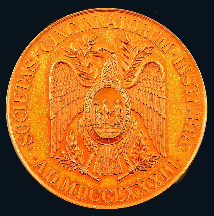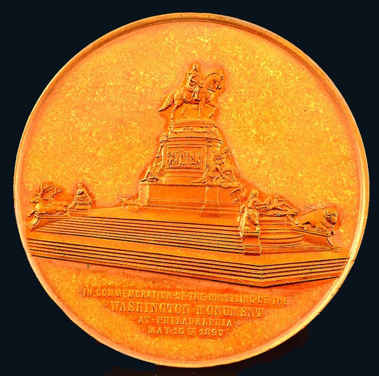 Philadelphia Society of the Cincinnati, Obv: Washington Monument, at centre, "In Commemoration Of The Unveiling Of The Washington Monument At Philadelphia, May15th 1897"; Rev: Large crest of the Society, "Societas Cincinnatorium Instituta- A.D. MDCCLXXXIII", Ae, 75.5mm, 200.75 gms, Baker S-324A, by Peter L. Krider Co., good EF. Lovely medal
