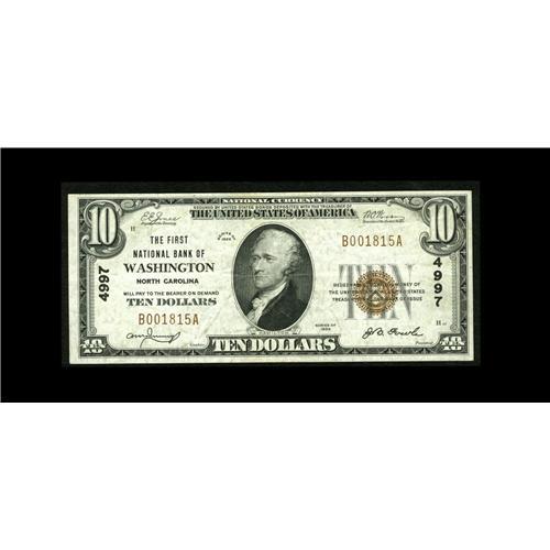 <B>Washington, NC</B></I> - $10 1929 Ty. 1 <B>The First NB</B></I> Ch. # 4997<BR>This bank fell victim to the Depression in 1931. The note we offer in this session is a still quite crispy <B>Very Fine+</B></I> enjoying considerable eye appeal. Nice enough to be worth...