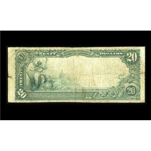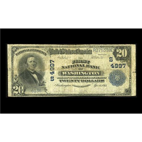 <B>Washington, NC</B></I> - $20 1902 Plain Back Fr. 657 <B>The First NB </B></I> Ch. # 4997<BR>This institution was the only issuer located here and lapsed into receivership in December of 1931. The Kelly census stands at 11 large survivors. This <B>Very Good</B></I> example has certainly seen its share of circulation, but is nicer than its technical grade might imply, a small margin separation at right being its most significant aesthetic challenge. Worth in the range of...