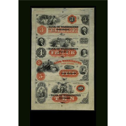 <B>Washington, NC- Bank of Washington</B></I> $3-$4-$5-$10 18__ G4a-G8a-G12a-G16a Uncut Sheet Remainder<BR>Here is a second chance to obtain an uncut sheet on this bank. The bottom note shows light handling. <B>Choice About Uncirculated.</B></I>