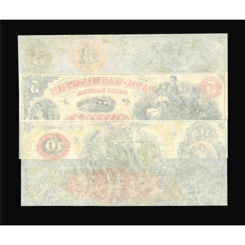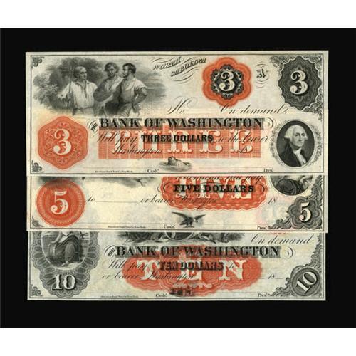 <B>Washington, NC- Bank of Washington </B></I>$3; $5; $10 18__ G4a; G12a; G15a<BR> These ABNCo remainders grade <B>Choice Crisp Uncirculated </B></I>or better with their vivid orange underprint and well preserved paper surfaces.<BR><BR><b>Shipping:</b> Coins & Currency (<a target="_blank" href="http://www.heritageauctions.com/common/shipping.php">view shipping information</a>)