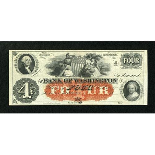 <B>Washington, NC- Bank of Washington </B></I>$4 G8a<BR> This beautifully original remainder shows a sheet fold near the bottom of the note. The colors are perfectly bright. <B>Choice About Uncirculated.</B></I><BR><I>From The Collection of a Louisiana Gentleman</B></I><BR><BR><b>Shipping:</b> Coins & Currency (<a target="_blank" href="http://www.heritageauctions.com/common/shipping.php">view shipping information</a>)