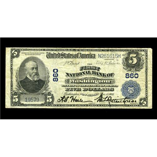 <B>Washington, NJ</B></I> - $5 1902 Plain Back Fr. 598 <B>The First NB </B></I> Ch. # 860<BR>Nicely circulated Third Charter $5 from this Warren county bank that operated from 1865 until the close of the National Banking period, some 70 years. <B>Fine.</B></I>