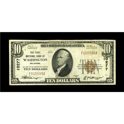 <B>Washington, OK</B></I> - $10 1929 Ty. 1 <B>The First NB</B></I> Ch. # 10277<BR>An evenly circulated and problem free example from this community's sole issuer. <B>Fine-very Fine.</B></I><BR><BR><b>Shipping:</b> Coin/Currency (<a target="_blank" href="http://www.heritageauctions.com/common/shipping.php">view shipping information</a>)