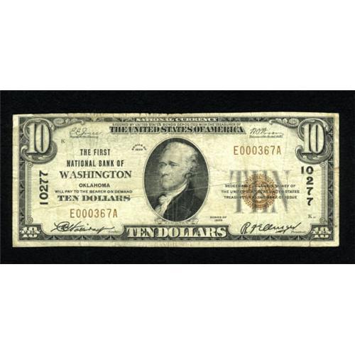 <B>Washington, OK</B></I> - $10 1929 Ty. 1 <B>The First NB</B></I> Ch. # 10277<BR> The paper on this moderately circulated issue remains fully intact as do all of the printed details. <B>Fine.</B></I><BR><I>From The Rolling Plains Collection</B></I><BR><BR><b>Shipping:</b> Coins & Currency (<a target="_blank" href="http://www.heritageauctions.com/common/shipping.php">view shipping information</a>)