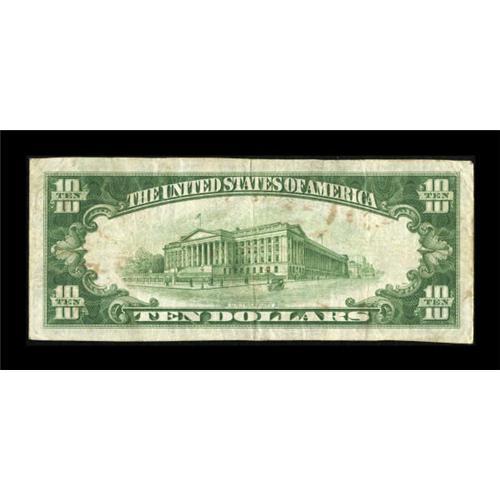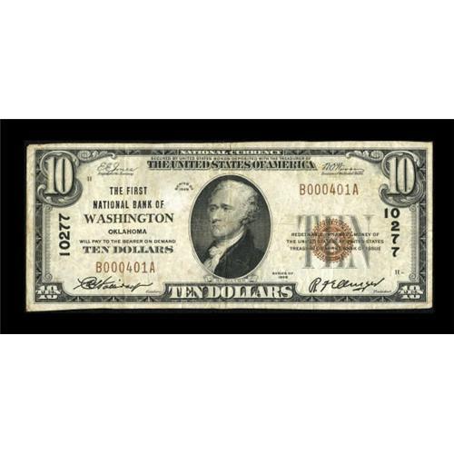 <B>Washington, OK</B></I> - $10 1929 Ty. 1 <B>The First NB</B></I> Ch. # 10277<BR> This bank was the sole issuer in this small community. This <B>Fine</B></I> example we offer here would likely grade higher but for some light staining present.<BR><BR><b>Shipping:</b> Coins & Currency (<a target="_blank" href="http://www.heritageauctions.com/common/shipping.php">view shipping information</a>)