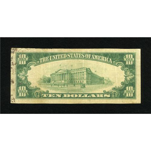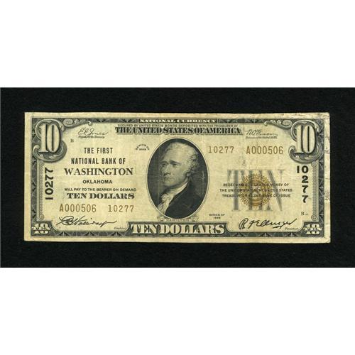 <B>Washington, OK</B></I> - $10 1929 Ty. 2 <B>The First NB</B></I> Ch. # 10277<BR>A mere four Type 2s are known from this McClain County bank. This piece is lightly toned with some moldy soil at right. <B>Fine.</B></I><BR><BR><b>Shipping:</b> Coins & Currency (<a target="_blank" href="http://www.heritageauctions.com/common/shipping.php">view shipping information</a>)