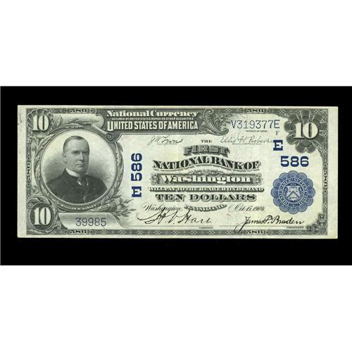 <B>Washington, PA</B></I> - $10 1902 Plain Back Fr. 624 <B>The First NB </B></I> Ch. # (E)586<BR>A solid <B>Extremely Fine</B></I> with superior centering, fully crisp bright paper and strong stamped signatures. A nice survivor from a bank which failed in 1927.