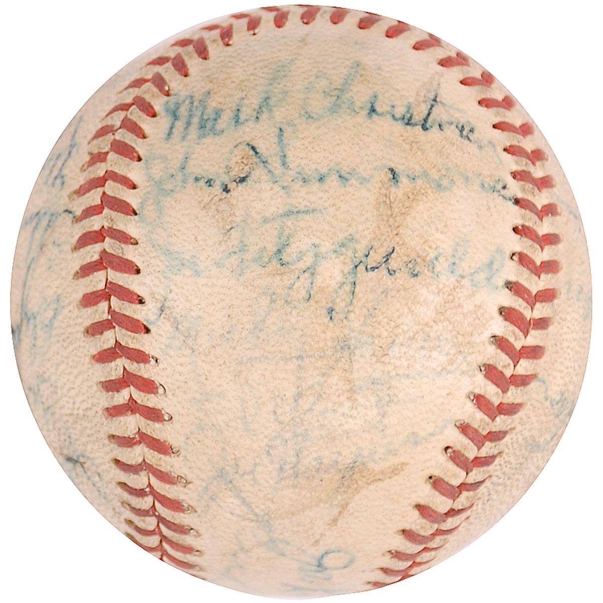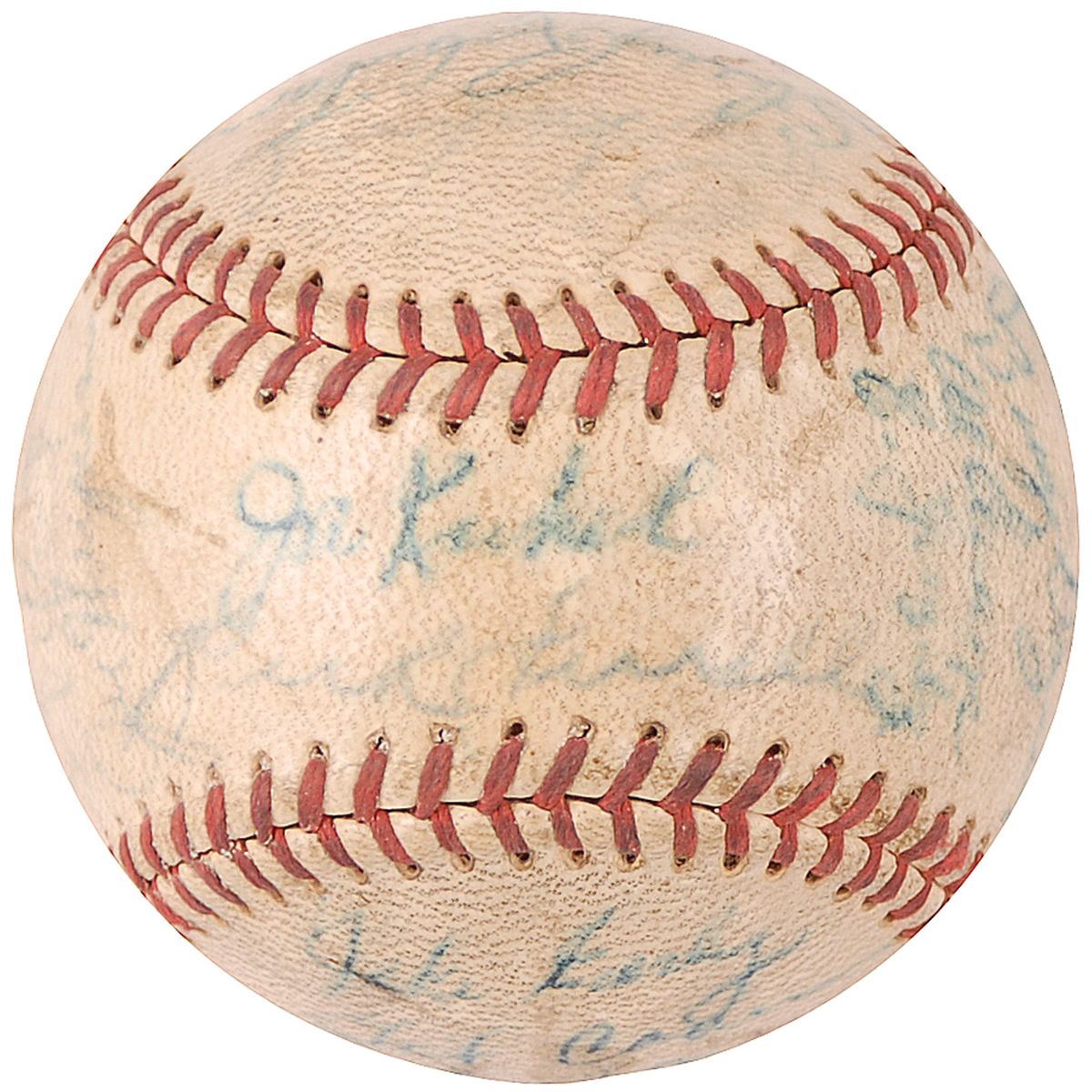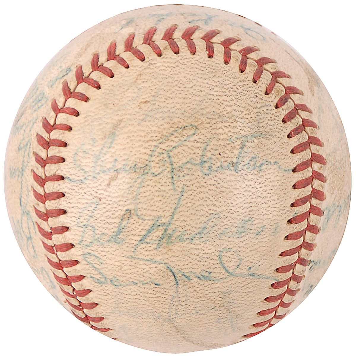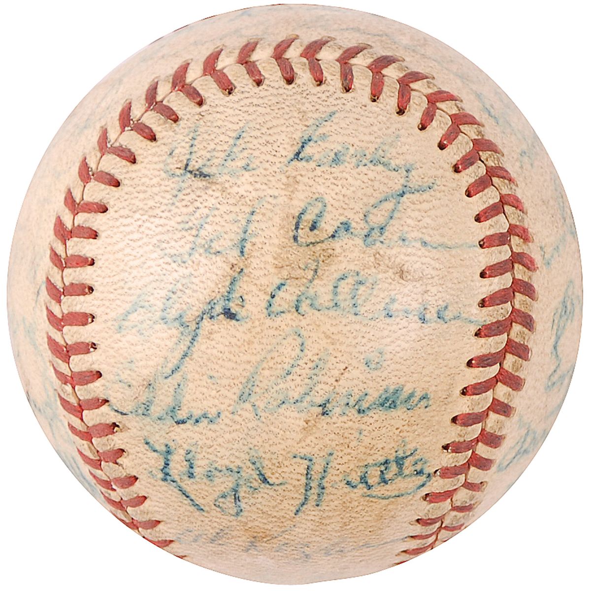 Baseball signed in blue ink by 25 members of the 1949 Washington Senators. Signers include: Joe Kuhel (ss), Rick Ferrell, Gil Coan, Lloyd Hittle, Roberto Ortiz, Eddie Robinson, Sherry Robertson, Buzz Dozier, and Dick Welteroth. In good condition, with some signatures faded and only slightly legible, brushing to other signatures, uniform toning, and an old coat of shellac applied to ball.