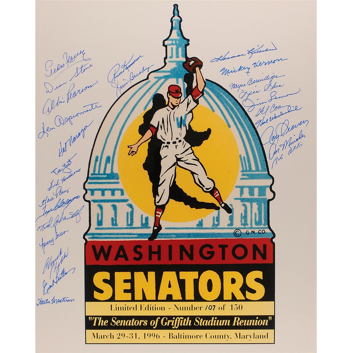 Limited edition color glossy 16 x 20 photo honoring the Washington Senators, numbered 107/150, signed in blue felt tip by 26 former Senators. Signers include: Harmon Killebrew, Ed Yost, Mickey Vernon, Roy Sievers, Albie Pearson, Spec Shea, Tex Clevenger, Dean Stone, and Chuck Stobbs. In fine condition.