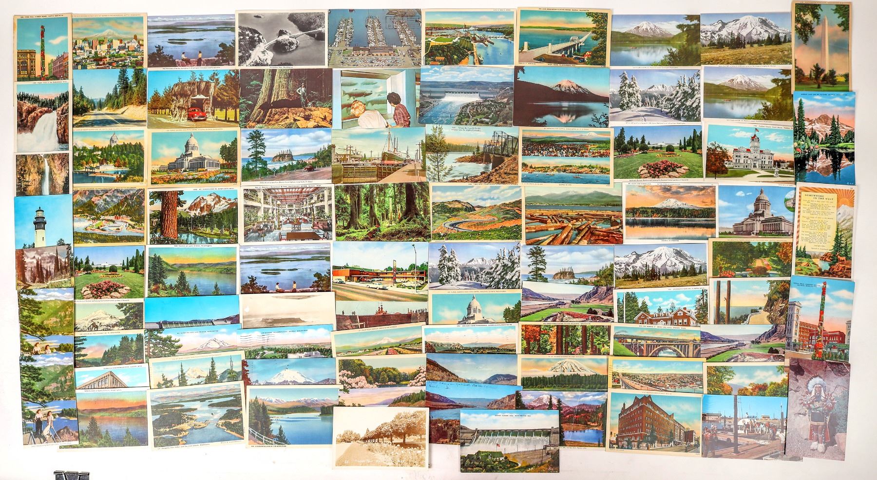 Lot of 75+. Mix of linen and photo-chrome cards. Mostly wht. borders. Two RPC's. Postmarks i.e.; Walla Walla, Coulee City, Tacoma, Seattle Terminal Annex, Wash. D.C., Portland Ore., Wenatchee. Street level view i.e; Grand Coulee Dam ( double 1 cent stamped),,Pioneer Park, several scenic lakes, valley and rivers including Mt. Rainier, Indian in full ceremonial dress, Motels/hotels, Dead Mans curve Cooke City Highway, Lake Washington Floating Bridge. Birdseye view i.e ; Seattle canal locksDeception Pass, San Juan Islands, Fisherman's Terminal Seattle, Seattle Business Dist.-Mt. Rainier background. Washington 1931-68 Ken Prag Collection