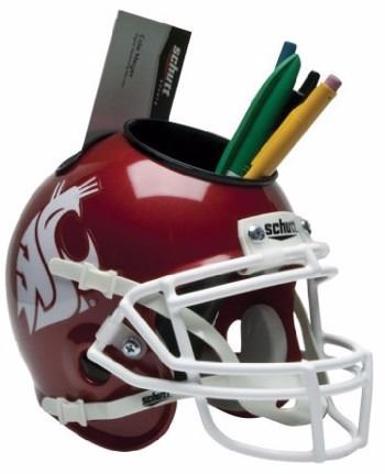 Schutt Sports NCAA Licensed Helmet Desk Caddy in the Washington State Cougars logo. Perfect for the home or work office, this attention-grabbing desk ornament leaves no doubt to guests and business acquaintances who's your team. Fill it with business cards and team-colored pens, but be prepared to talk Cougars football when people roll in.
